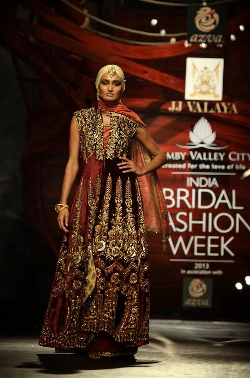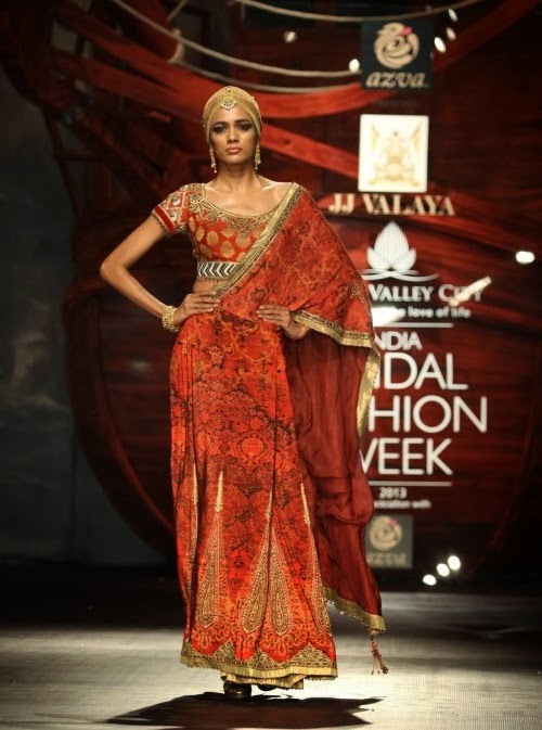 Bollywood actress, Esha Gupta showed off the latest Azva gold jewellery line as she walks the ramp for designer, JJ Valaya in a fascinating lehenga at the Aamby Valley India Bridal Fashion Week (IBFW) 2013, in Mumbai, India, which was held on December 3rd 2013. Esha Gupta’s look was a mix of tradition and modern, amalgamated into one. Her outfit was majorly dominated by colours of orange and flowing into red. She wore a sexy lehenga that had a cross over panel choli and her skirt was fitted from the top and structured into an A-line shape at the bottom.